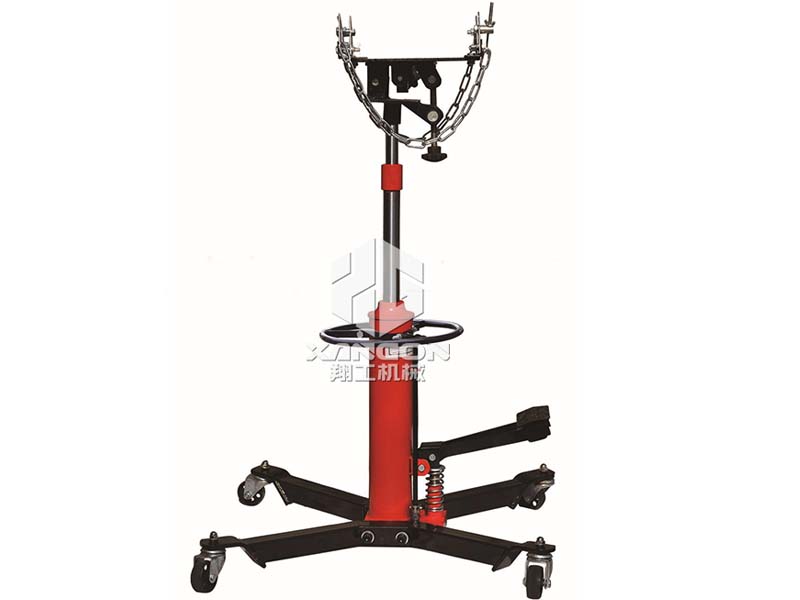 2、將液壓運(yùn)送舉升器推入汽車(chē)下面,并將液壓運(yùn)送舉升器升到合適位置,拆下需維修的物件(如:變速箱、發(fā)動(dòng)機(jī)、傳動(dòng)軸、前后橋等)放于托架中,然后用鋼鏈系牢物件,打開(kāi)卸荷閥,將托架和物件放到底位。