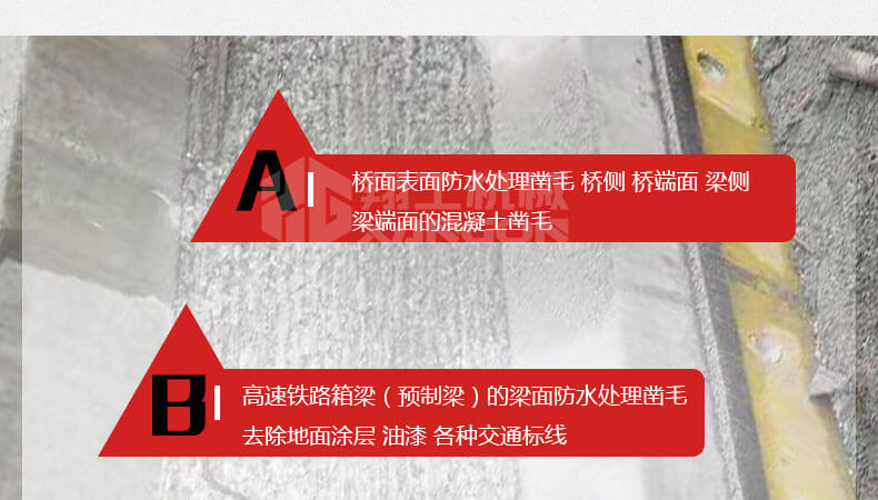11頭鑿毛機的鑿頭有11個,它的鑿毛能力是指混凝土強度在C30-C40之間的參考 值,根據(jù)施工混凝土強度和鑿毛頭的鋒銳程度的不同,鑿毛效率會 有所區(qū)別。鑿頭高速敲擊混凝土,處理后表面比研磨和銑刨的粗造。一次可去除混凝土厚度達 0-8mm。特別適合高速橋面等高質(zhì)量鑿毛。因其獨特的工作方式, 可對C50的高強度混凝土鑿毛,是世界上頂尖的鑿毛工具。該11頭鑿毛機,鉆錘設(shè)計,獨特的工作頭為合金剛